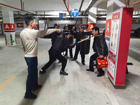與此同時,應(yīng)急處置崗隊員也攜帶防暴盾牌、橡膠棍等專業(yè)器械火速集結(jié),以最快速度抵達地下車庫指定區(qū)域。面對負隅頑抗的 “盜竊分子”,隊員們沉著冷靜,憑借日常訓(xùn)練形成的默契配合,迅速結(jié)成戰(zhàn)術(shù)小組,從不同方向?qū)?“盜竊分子” 實施包圍,果斷出擊、動作規(guī)范,僅用數(shù)分鐘便成功將其治服,并移送公安機關(guān)處理。
